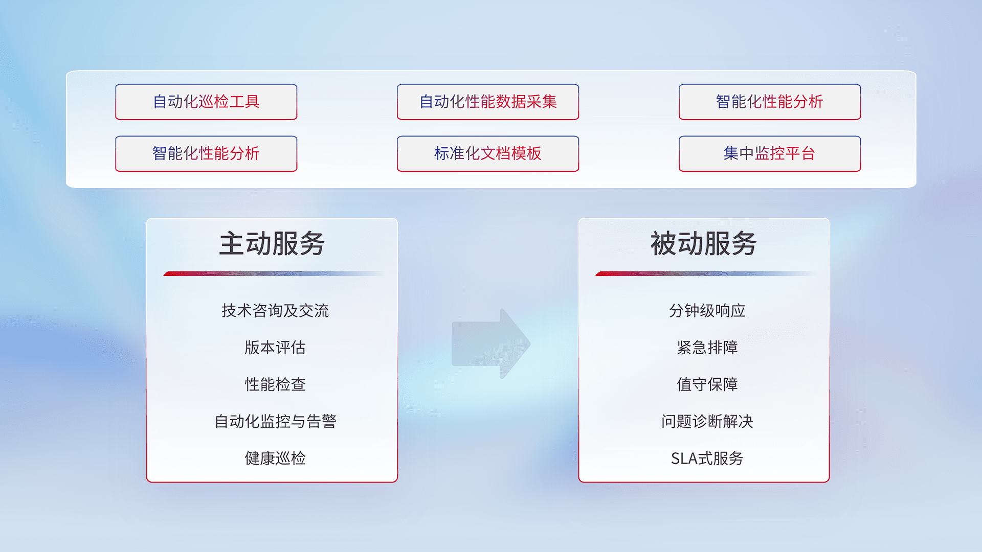 智能化工具和标准化文档,,,保障服务质量,,,提供主动服务(包含技术咨询、、、版本评估、、、性能检查、、自动化监控与告警、、、健康巡检)和被动服务包含(分钟级响应、、、紧急排障、、、、值守保障、、、问题诊断解决、、、、SLA服务)。。